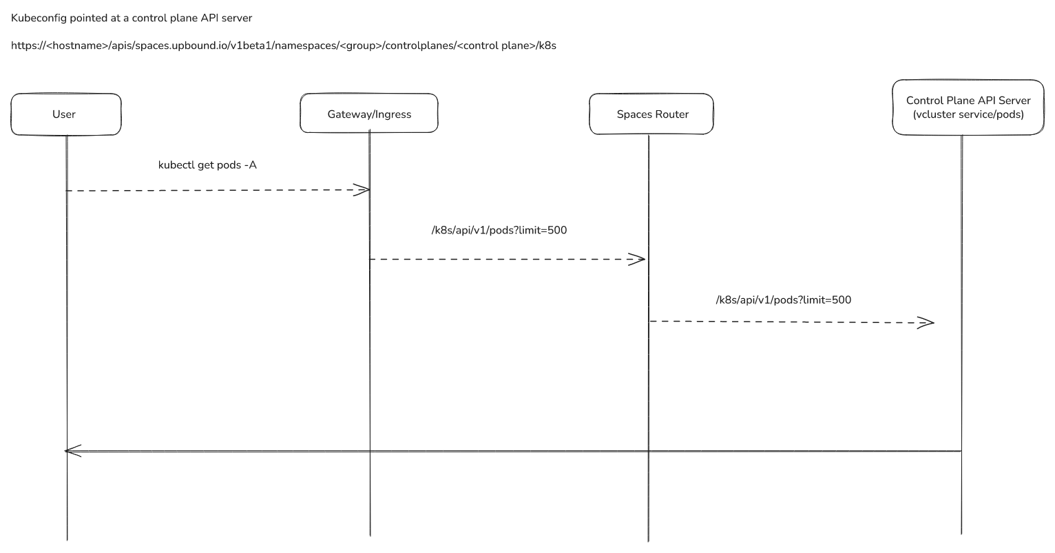 spaces-router: Entry point for all endpoints, dynamically builds routes to control plane API serversspaces-controller: Reconciles Space-level resources, serves webhooks, works withmxp-controllerfor provisioningspaces-api: API for managing groups, control planes, shared secrets, and telemetry objects (accessed only through spaces-router)spaces-apollo: Hosts the Query API, connects to PostgreSQL database populated byapollo-syncerpods